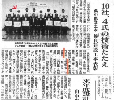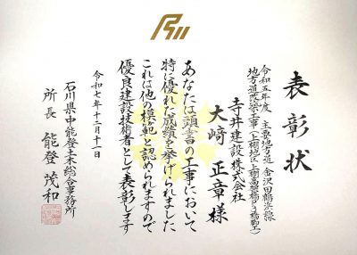 令和7年12月11日、石川県中能登土木総合事務所において今年度の優良建設技術者の表彰式が行われ、弊社社員 大﨑正章が表彰されました。