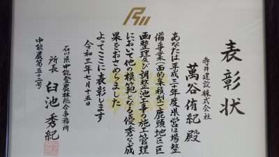 令和3年7月27日、寺井建設社員 坂井邦洋が優良建設技術者(工事)として