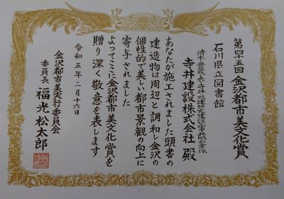 令和5年2月16日、寺井建設が金沢都市美文化賞を受賞しました。